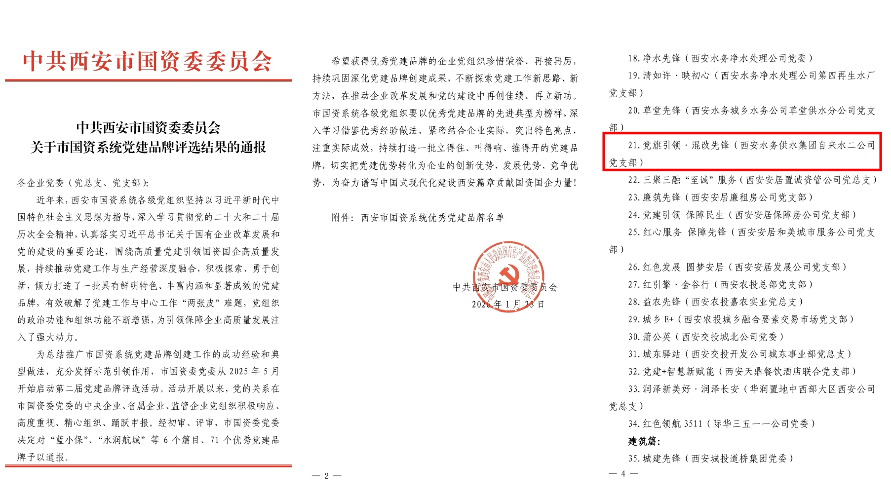 On January 23, the Party Committee of the State-owned Assets Supervision and Administration Commission of Xi'an City issued the "Notice on the Evaluation Results of Party Building Brand Projects in the Municipal State-owned Assets System." After preliminary review and evaluation, the Party Committee of the State-owned Assets Supervision and Administration Commission decided to recognize six categories and 71 Party building brands. The Party Branch of Xi'an Second Water Supply Engineering Co., Ltd., under the Party Committee of the Water Supply Group, successfully won the "People's Livelihood Chapter" Party building brand branch in the municipal state-owned assets system with its creation brand titled "Party Flag Guidance, Pioneer in Mixed Ownership Reform." The achievement of this honor is the result of the correct leadership of the Party committees at both the Water Supply Group and the Water Supply Corporation levels, as well as the hard work and dedication of all Party members and cadres in the second company's Party branch!